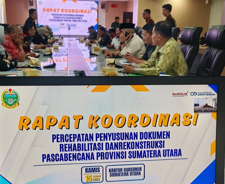Rapat dipimpin oleh Pj Sekretaris Daerah Provinsi Sumut dan dihadiri unsur pengarah BNPB, perwakilan kementerian/lembaga, serta pemerintah kabupaten/kota terdampak.