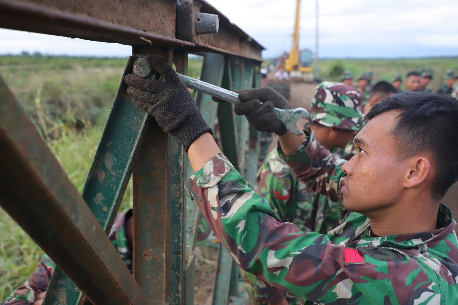 Para personel TNI telah melakukan bongkar muat material jembatan bailey yang berbobot 24 ton. Pemasangan jembatan ini ditargetkan selesai pada 12 Desember 2025. BNPB melalui Pos Pendamping Nasional Wilayah Sumbar memantau progress pemasangan jembatan bailey tersebut.